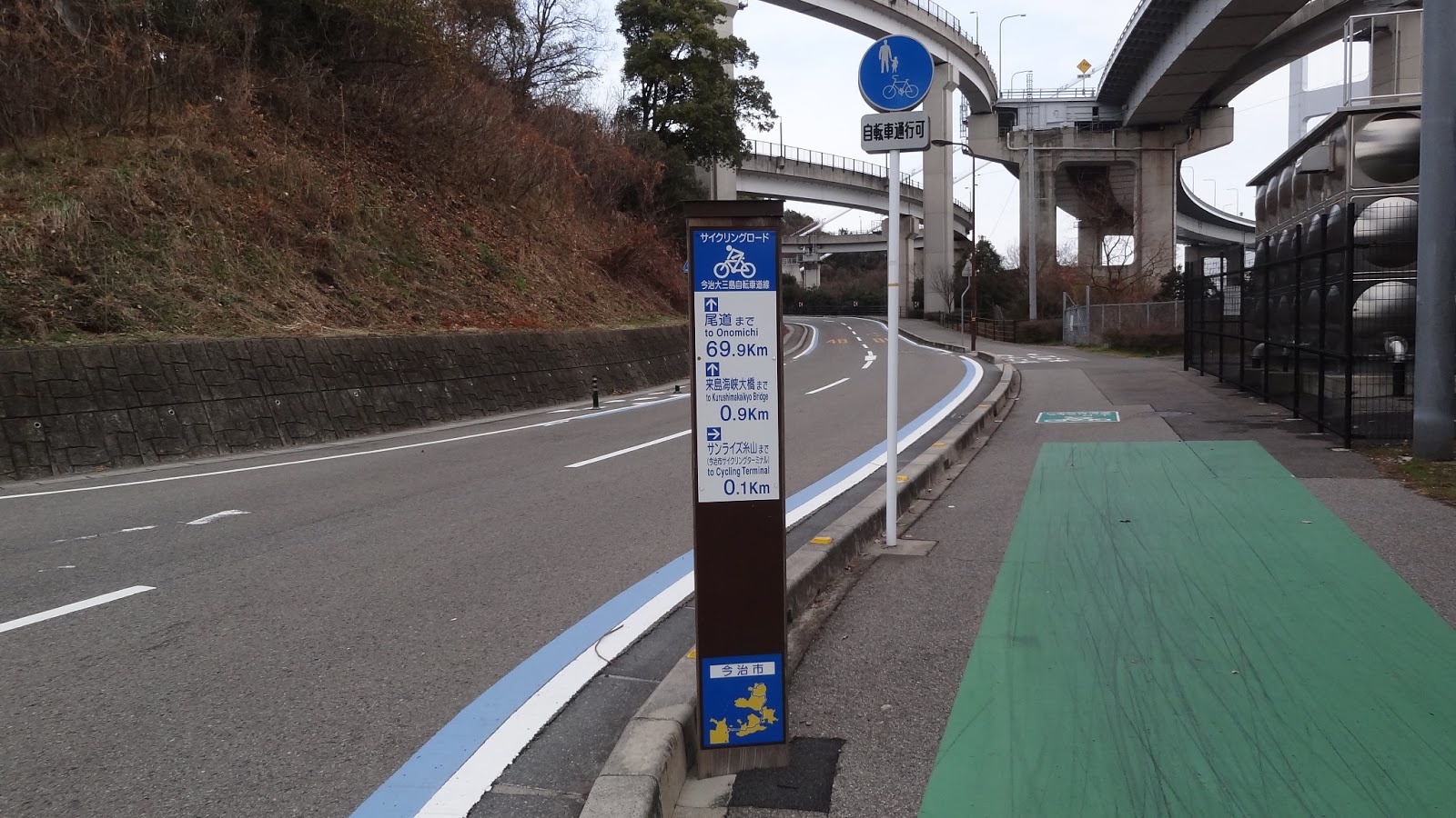 自転車は左側通行なので手前の青い線は尾道から今治へ行く道です。