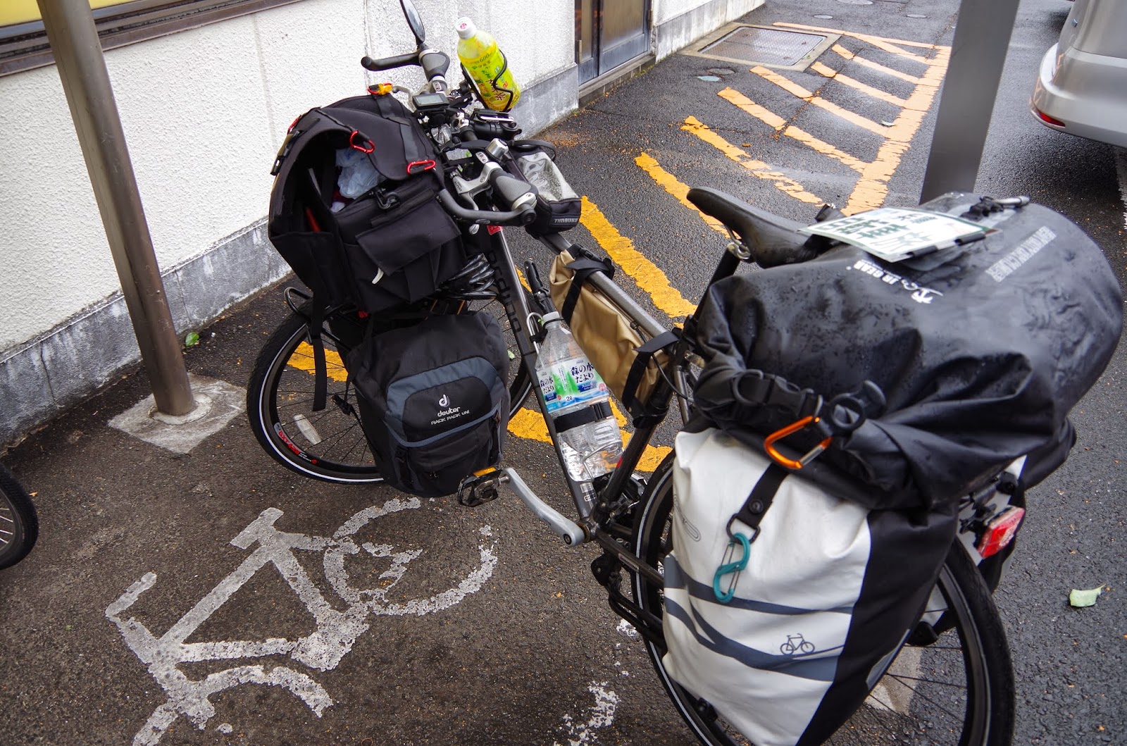 雨で自転車がびしょ濡れ。でも荷物は全部防水なので大丈夫!