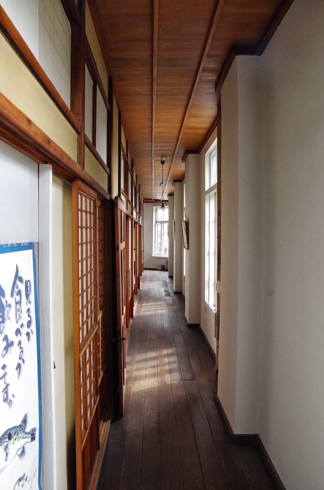 2階の手摺は当時のままの木製。建築基準法のない時代に建てられたので通路は狭く、手すりは低く、通路を歩くのはちょっと怖いです。